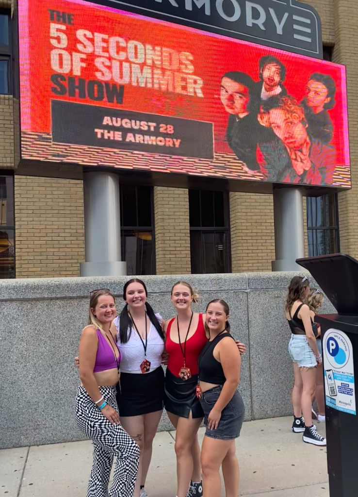 One thing about me is that I love going to concerts, specifically to see 5 Seconds of Summer. I have seen them live in concert 7 times now, and they really are a sense of continuity in my life, especially through all of the change I have experienced in the last decade. After 5 Seconds of Summer, also known as 5SOS (pronounced like five sauce) opened for One Direction on their 2014 ‘Take Me Home’ tour (which I am still so upset that I missed) they skyrocketed to fame as the next band made up of cute teenage boys. Naturally, I was obsessed with them. Since seeing their music video for the song “Try Hard” and falling in love, I have seen them at the Xcel Energy Center three times. The first two occasions were their headlining tours, referred to as the ‘Rock Out with your Socks Out’ tour in 2015, and the ‘Sounds Live Feels Live’ tour in 2016. After that, they took a little break, which obviously broke my heart, but they were back in Minneapolis at The Armory in 2018, and of course I was there. Shortly after, in 2019, they opened for The Chainsmokers at the Xcel Energy Center. I was not crazy about The Chainsmokers, so I stayed for 5SOS and left after that. The summer of 2022, I purchased a VIP ticket to their show at the Armory, which would permit me to go to their soundcheck and get early entry to the venue. I was so excited, but then my friend decided to plan her wedding for that day and unfortunately I was unable to go. Luckily, I have friends that are just as crazy for this band as I am, and we took a road trip to St. Louis, Missouri to see their ‘Take My Hand’ tour. This summer, in the great year of 2023, I finally got to experience the VIP package in Minneapolis at the Armory, and also travelled to see them again in Chicago. This blog post will review my overall experience at both of these respective shows.