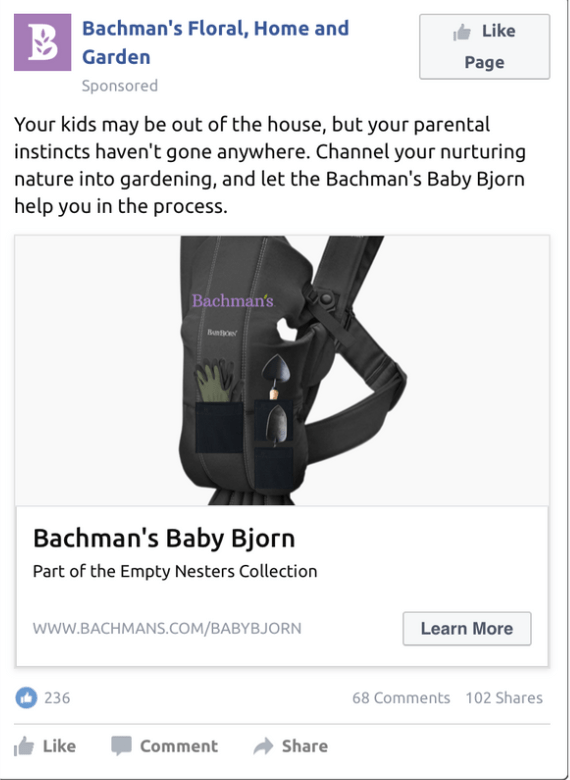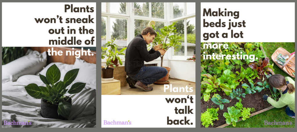 For one of my classes, my group was tasked with creating a creative advertising campaign for Bachman’s. We chose to target empty nesters and stick with the creative idea “Plants Aren’t Kids,” to emphasize that gardens can be a new pride and joy where kids once were. This campaign won two bronze pins at the 2024 Minnesota AdFed’s “The Show.”