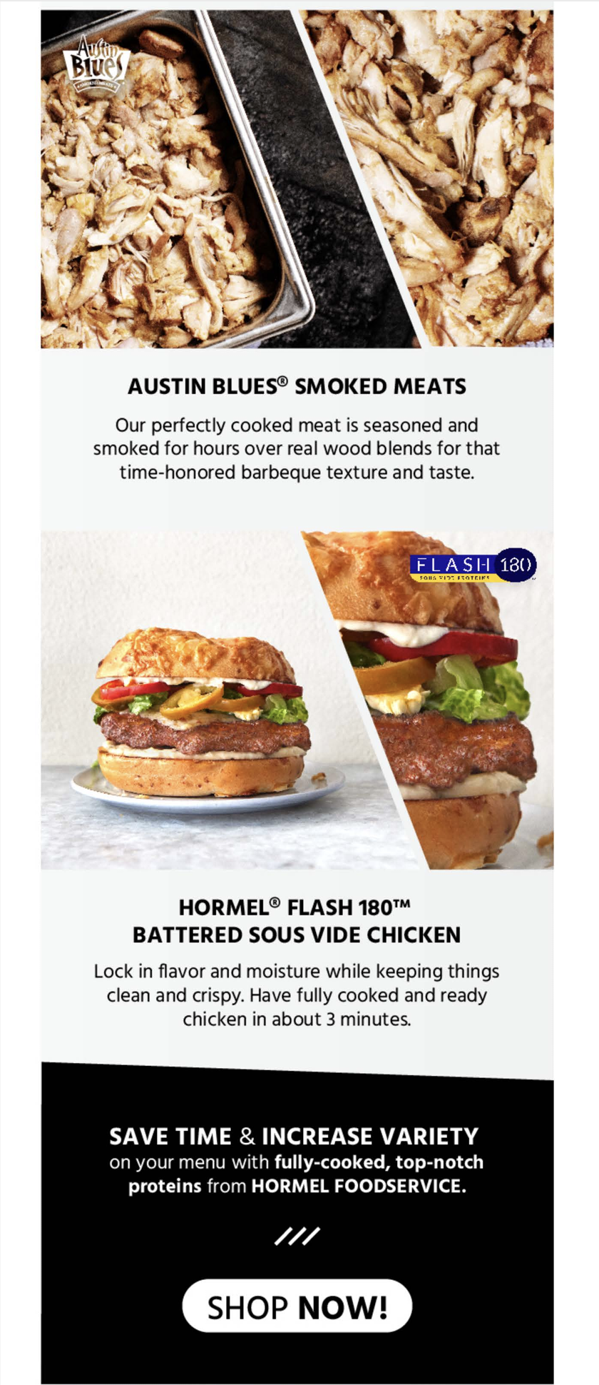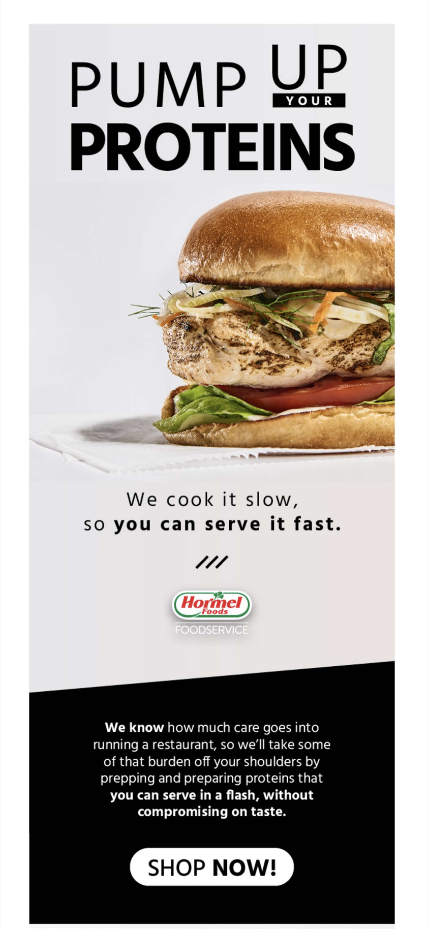 We were tasked with creating a e-blast and several banner ads to highlight Hormel Foodservice’s PREMIUM prepared Proteins, and the ease they provide restaurant operators. My role in this assignment was copywriter.